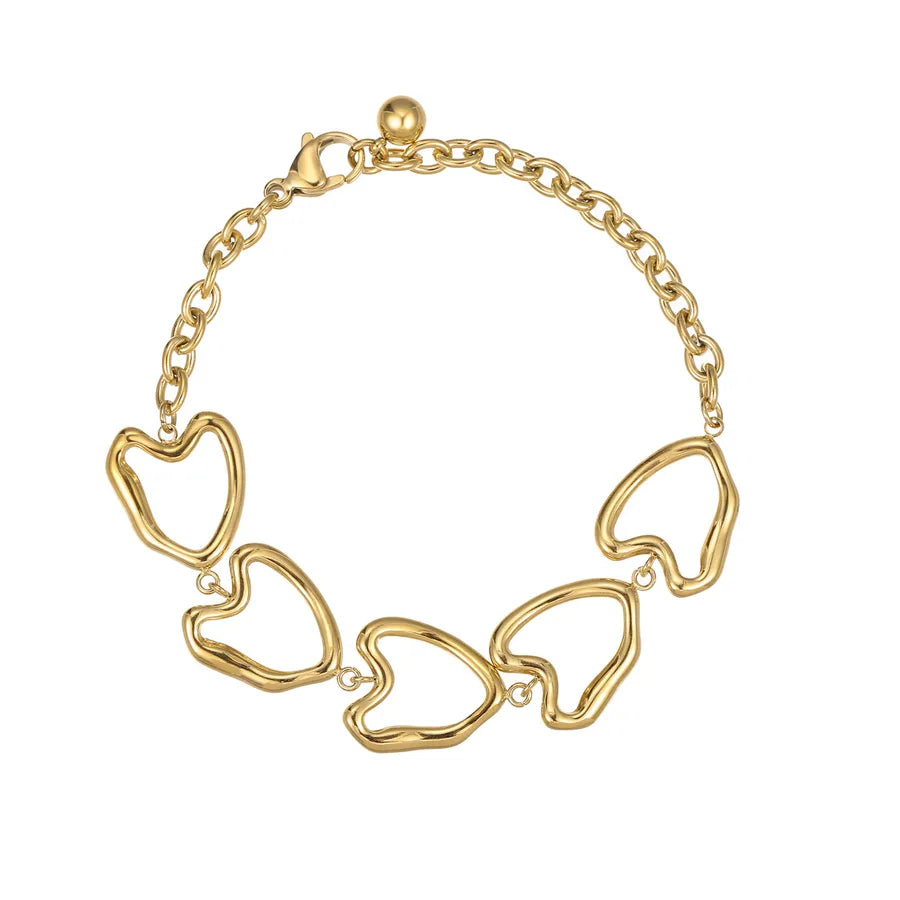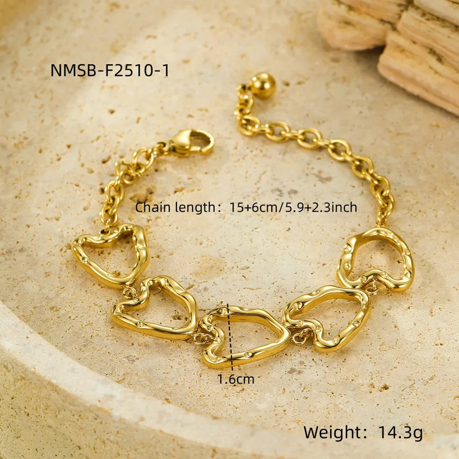 Crafted from high-quality 304 stainless steel with real 18K gold plating via PVD coating (0.03µm–0.05µm), this bracelet is waterproof, non-tarnish, and features a hollow-out heart design for a trendy, lightweight look (18g).