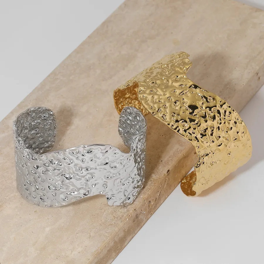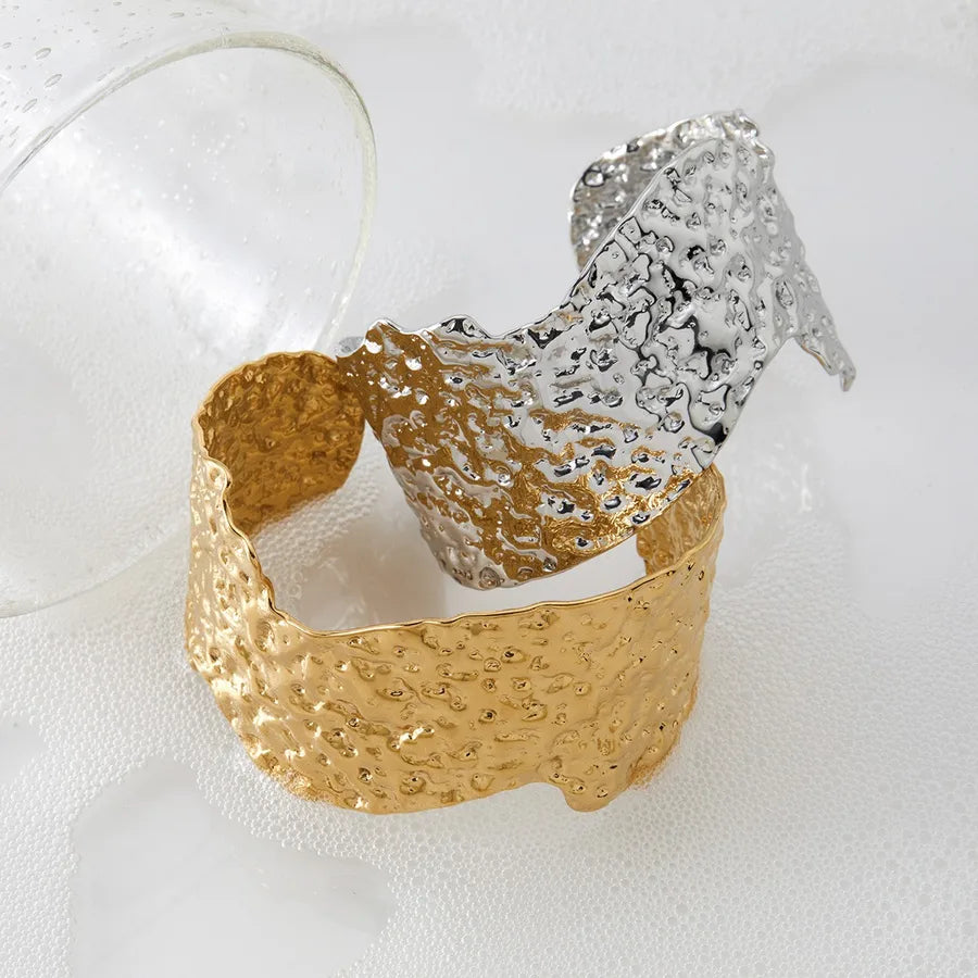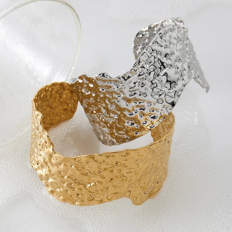 This wide, adjustable bracelet features a unique geometric texture and is electroplated with high-quality 16K gold and platinum using PVD coating, ensuring a non-fading, long-lasting finish.