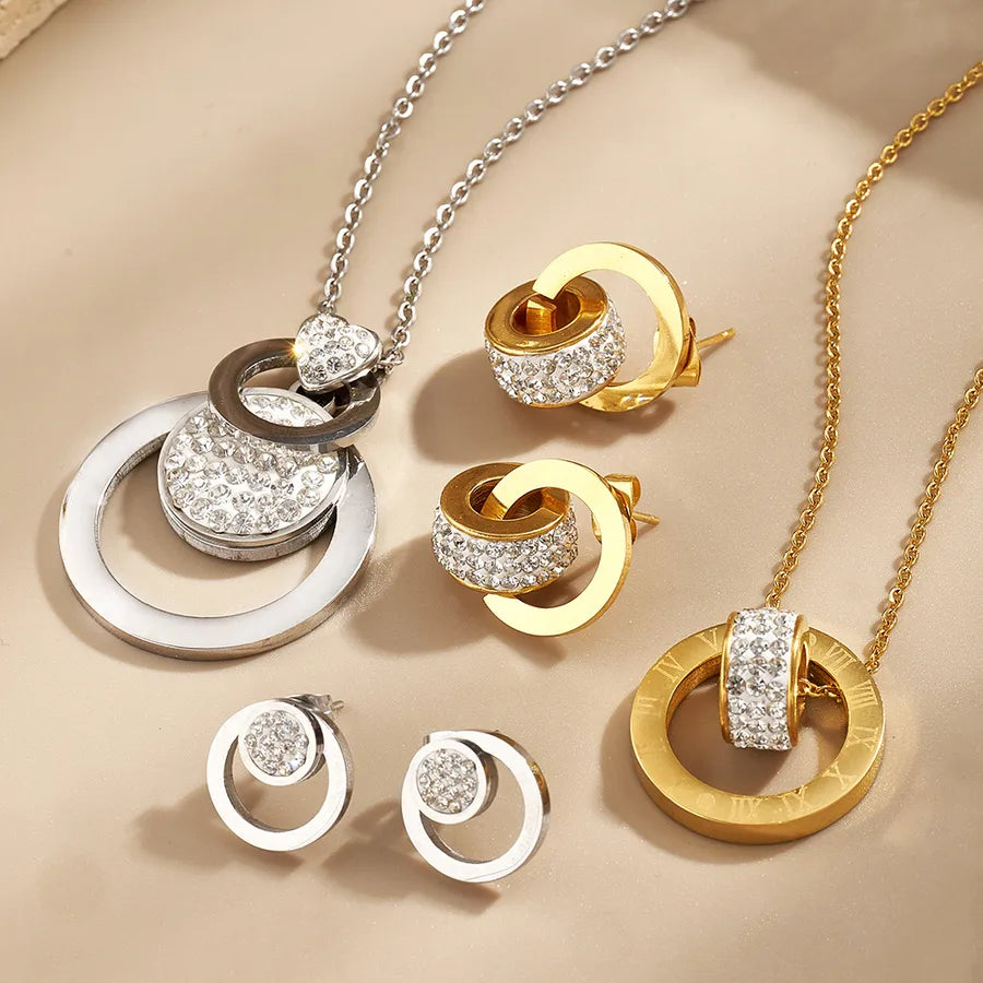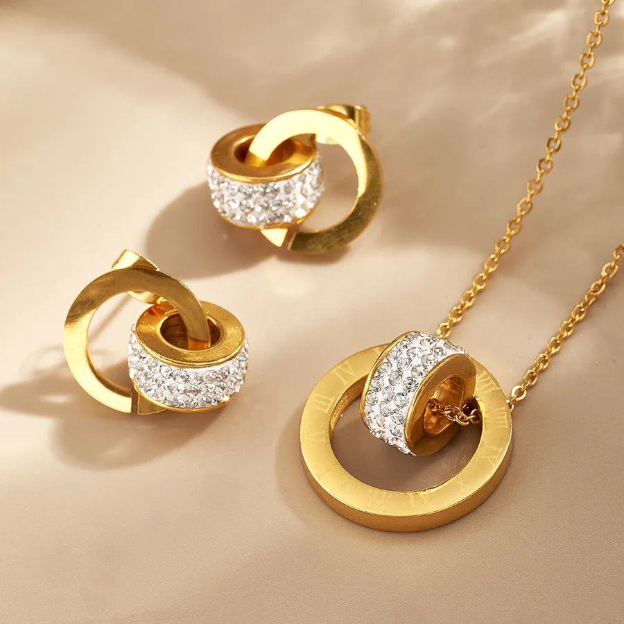 Elevate your style with this Double Ring Round Zircon Jewelry Set for women. Crafted from durable 304 stainless steel and finished with luxurious 18K real gold plating using a PVD-coated process, this set offers long-lasting shine and premium quality.